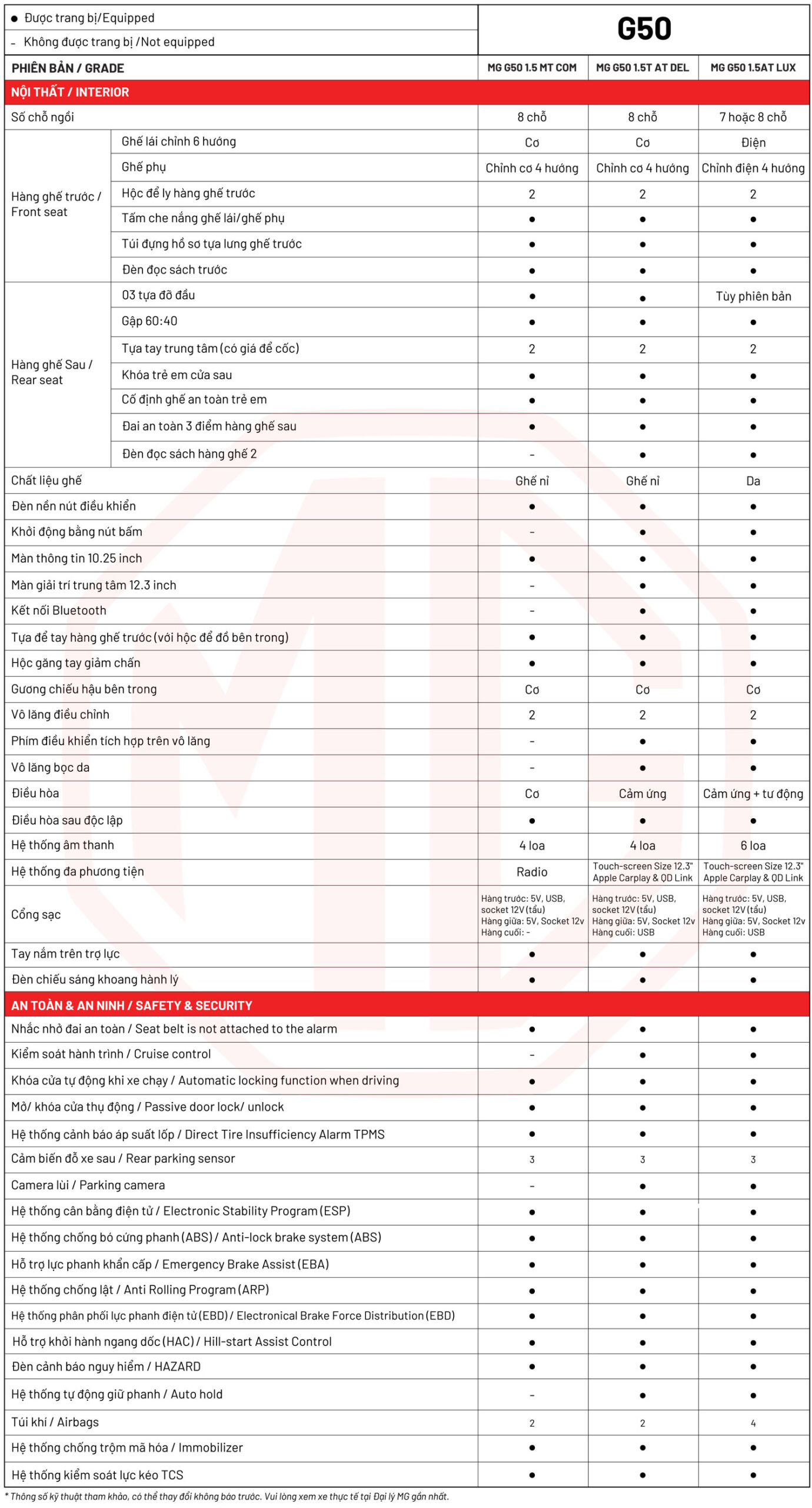 Các phiên bản xe MG G50
